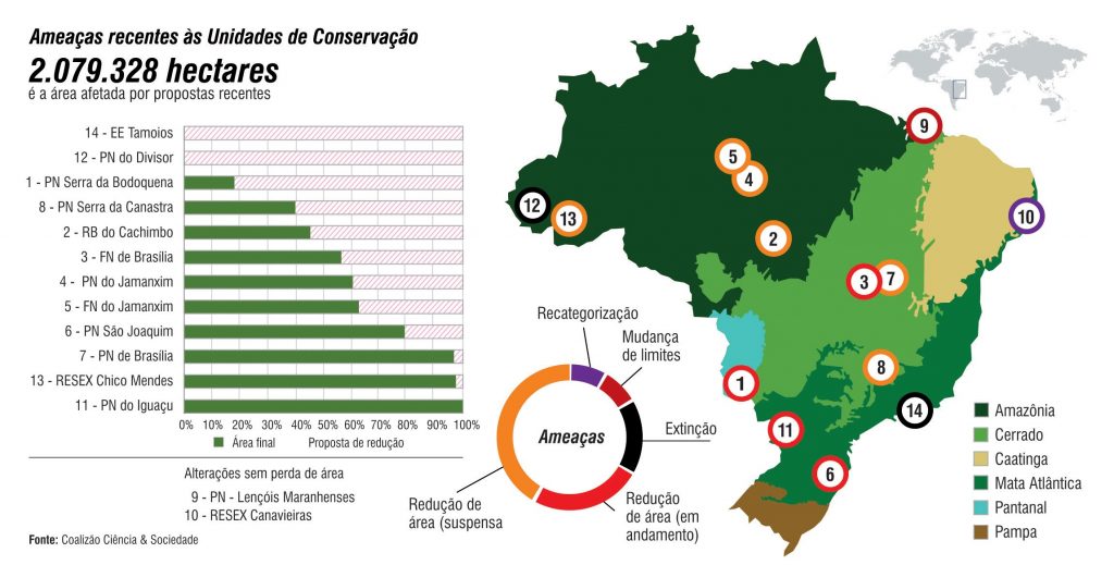 A Estação Ecológica de Tamoios (RJ) e o Parque Nacional da Serra do Divisor (AC) podem ser extintos e convertidos em outros tipos de áreas protegidas. Ao mesmo tempo, parques nacionais do Jamanxim (PA) e das serras da Bodoquena (MS) e da Canastra (MG), Reserva Biológica do Cachimbo (PA) e Floresta Nacional de Brasília (DF) perderão grande parte de seus territórios.