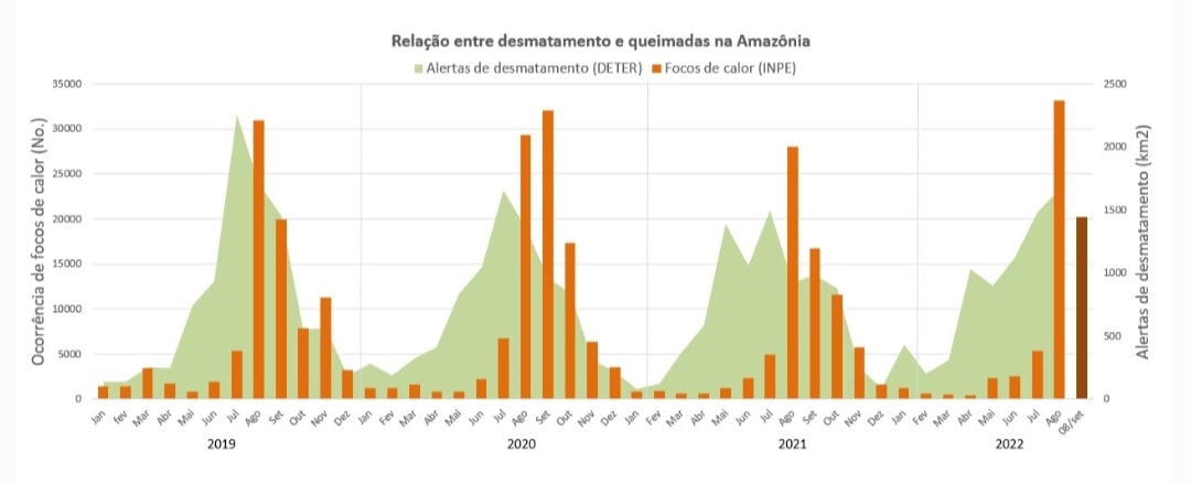 Os episódios remontam ao “Dia do Fogo”, quando, em 10 e 11 de agosto de 2019, teria se articulado um movimento conjunto para atear fogo na maior floresta tropical do mundo. Somente nesses dois dias, o Inpe detectou 1.457 focos de calor na Amazônia, que fechou aquele mês de agosto com 30.900 focos. Em 2022, agosto se encerrou com 33.116 focos ativos no bioma.