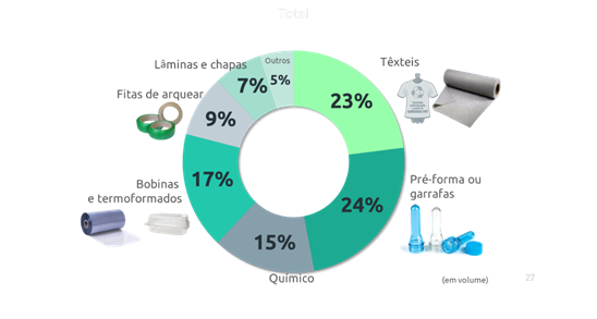 Mercado Têxtil: também nesse setor são inúmeras as aplicações do PET reciclado (fibras para carpete, forrações automotivas, cerdas para escovas, mantas para edredons, travesseiros, não tecidos (TNT), calçados, geotêxtis etc). Talvez tenha sido o setor com maior impacto na crise, onde várias empresas aproveitaram para dar férias aos seus funcionários e também suspenderam o contrato de trabalho. Nesses meses de crise, esse setor chegou a paralisar mais de 40% de suas atividades. A mais forte redução da demanda veio do mercado automotivo, que quase parou suas compras desse setor.