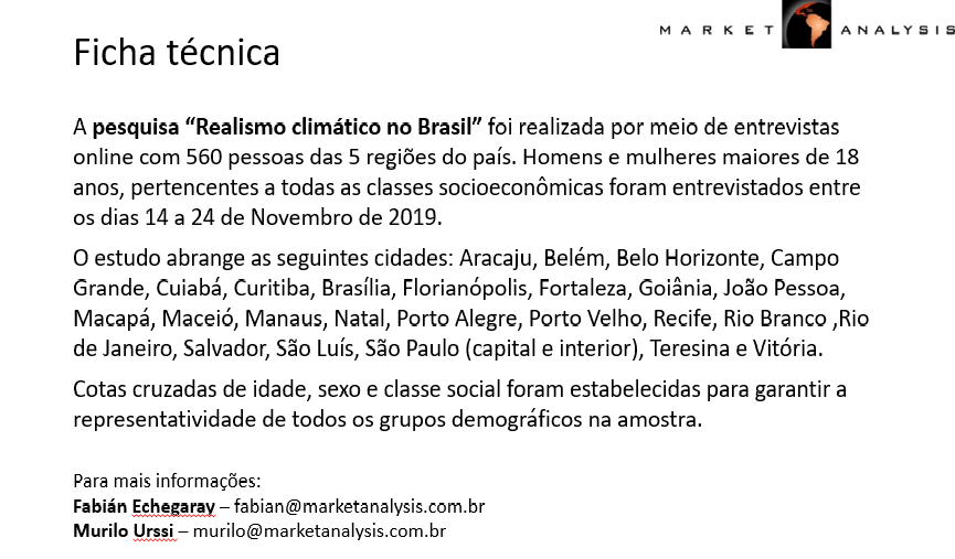 A pesquisa “Realismo climático no Brasil” idealizada e desenvolvida pelo instituto Market Analysis revela que em aberto contraste à posição oficial, os brasileiros entendem as mudanças climáticas como um fenômeno concreto, urgente, impactante e de raiz humana.