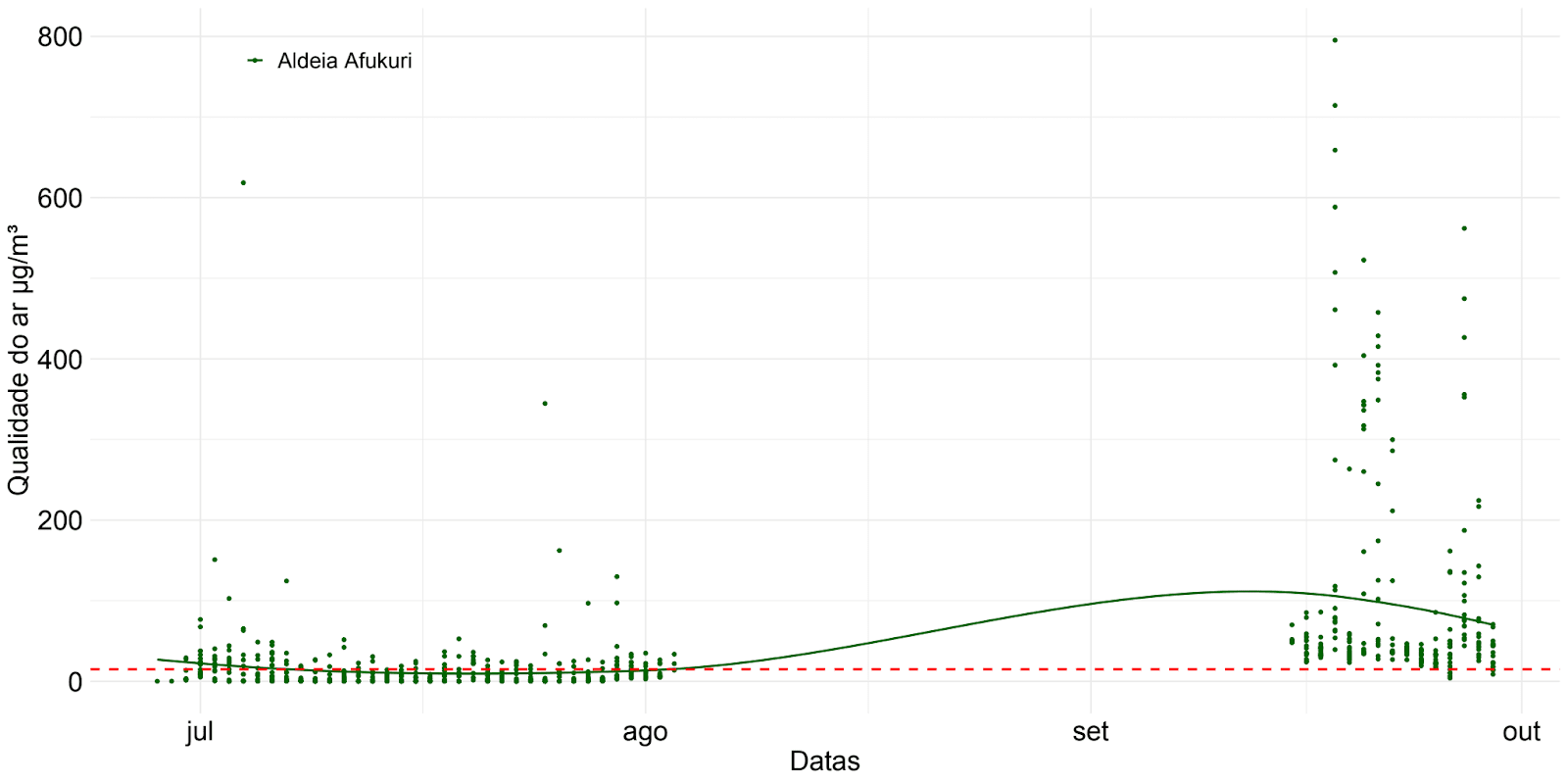 A aldeia Afukuri, no Território Indígena do Xingu, sudoeste da Amazônia, registrou uma qualidade do ar 53 vezes pior do que o indicado como aceitável pela OMS (Organização Mundial da Saúde) na segunda quinzena de setembro deste ano. O povo Kuikuro ficou exposto 17 horas por dia à concentração de 795 microgramas de material particulado de fumaça de queimadas e poluentes, por cada metro cúbico de ar. A recomendação internacional estabelece esse limite até 15 μg/m³ para não prejudicar a saúde.