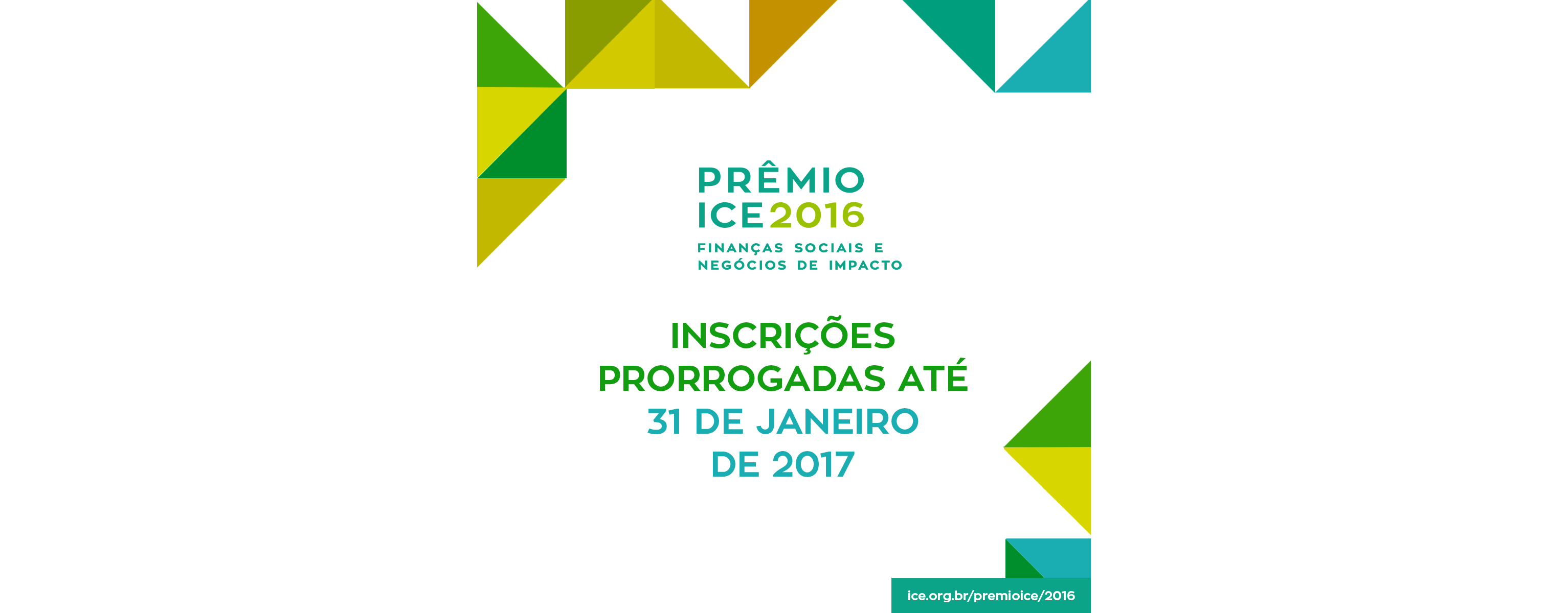 São Paulo, 30 de setembro de 2016 – As inscrições para a 3ª Edição do Prêmio ICE – Finanças Sociais e Negócios de Impacto foram prorrogadas até 31 de janeiro de 2017, seguindo o cronograma dos cursos de graduação e pós-graduação do país.