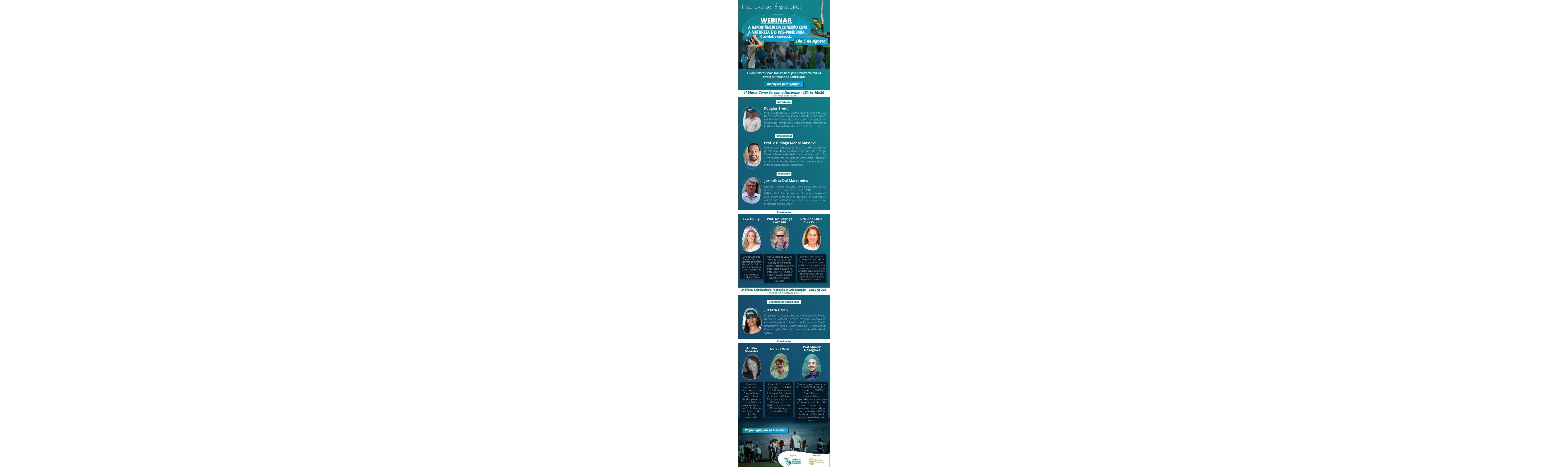 Grandes nomes e grandes ideias completam o Webinar sobre a Importância da conexão com a natureza para aumentar nossa criatividade, senso de coletividade e colaboração, desafios que humanidade enfrentará no pós-pandemia para vencer o novo paradigma baseado em um modo de trabalho mais colaborativo e solidário, com menos ego e individualismo, proporcionando um mundo mais sustentável, com recursos naturais e geração de empregos pós pandemia da Covid-19.