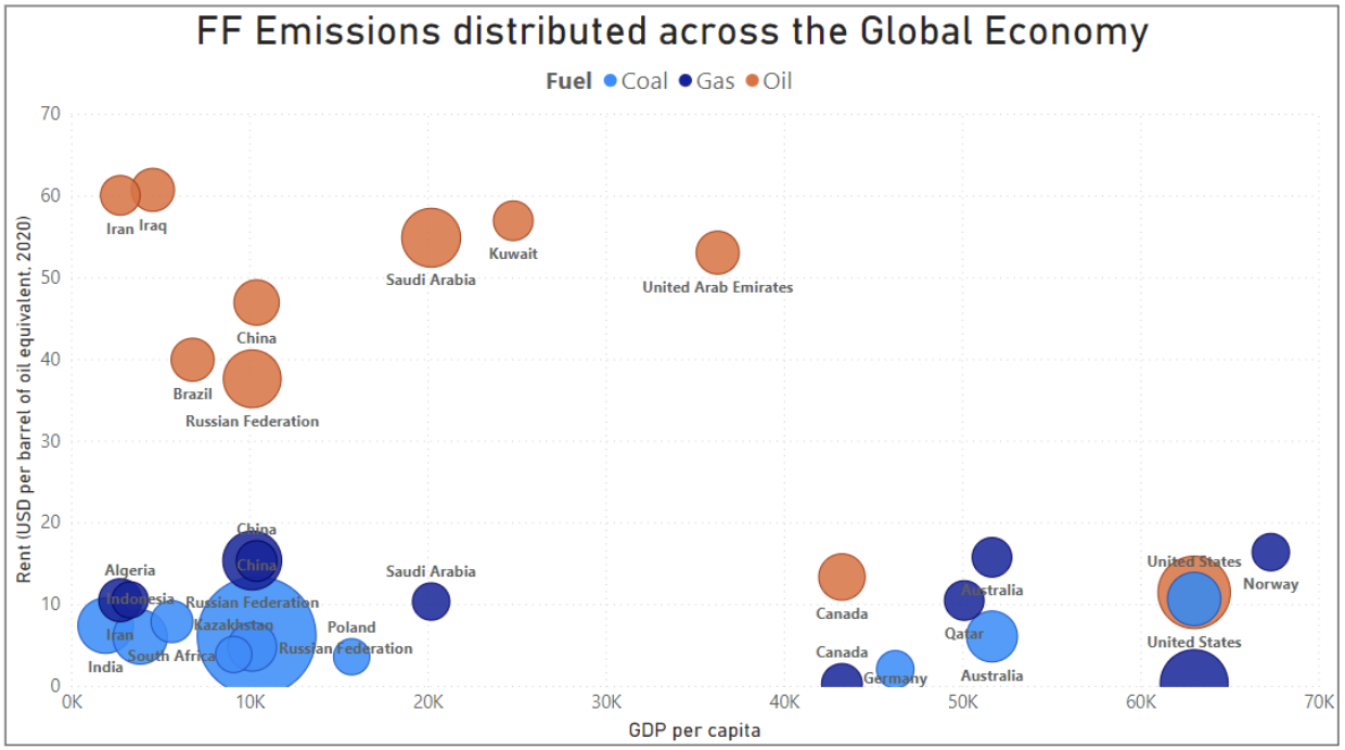 Uma das primeiras “aplicações híbridas” mapeia as emissões de combustíveis fósseis em relação a sua rentabilidade e localização em termos de PIB per capita, conforme o gráfico abaixo.