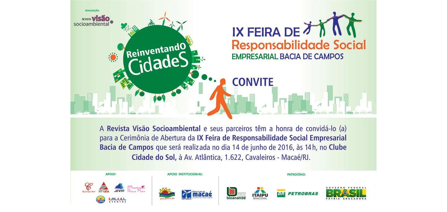 Transferida para os dias 14, 15 e 16 de junho, das 14 às 21 horas, no Clube Cidade do Sol, em Macaé, a IX Feira de Responsabilidade Social Empresarial Bacia de Campos, realização da Revista Visão Socioambiental e parceiros, terá como tema central “Reinventando as cidades”. O evento disponibilizará ao público, com entrada gratuita, um fórum com mais de 20 painéis e palestras, além de stands de empresas, órgãos públicos, organizações não governamentais, mostra de cinema socioambiental, oficinas, exposições e performances.