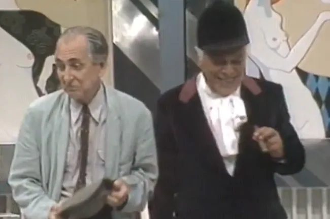 Foto: Brandão Filho (esquerda) e Paulo Gracindo (direita), em cena do quadro “Primo Rico e Primo Pobre”, do programa “Balança mas não Cai”. (fonte: cópia de tela, Memória Globo).