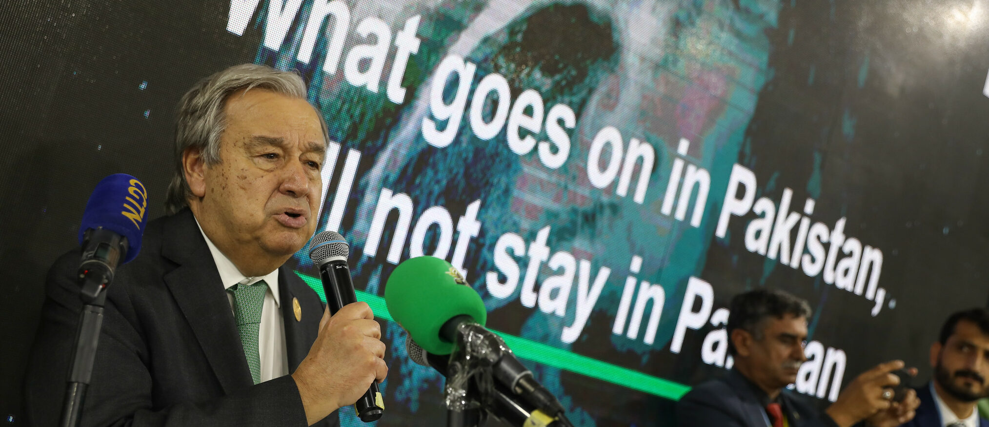 Em outro evento na COP, ao lado do primeiro-ministro do Paquistão, Shehbaz Sharif, o secretário-geral da ONU afirmou que a comunidade internacional “tem o dever de apoiar maciçamente” o país, em razão das inundações que o devastaram nos últimos meses. “O Paquistão merece que perdas e danos sejam considerados uma realidade e que essa realidade seja reconhecida por meio de mecanismos financeiros que, espero, esta conferência possa decidir.” Guterres defende que seja possível trocar o pagamento da dívida de países como o Paquistão por investimentos em recuperação e reconstrução após desastres naturais.