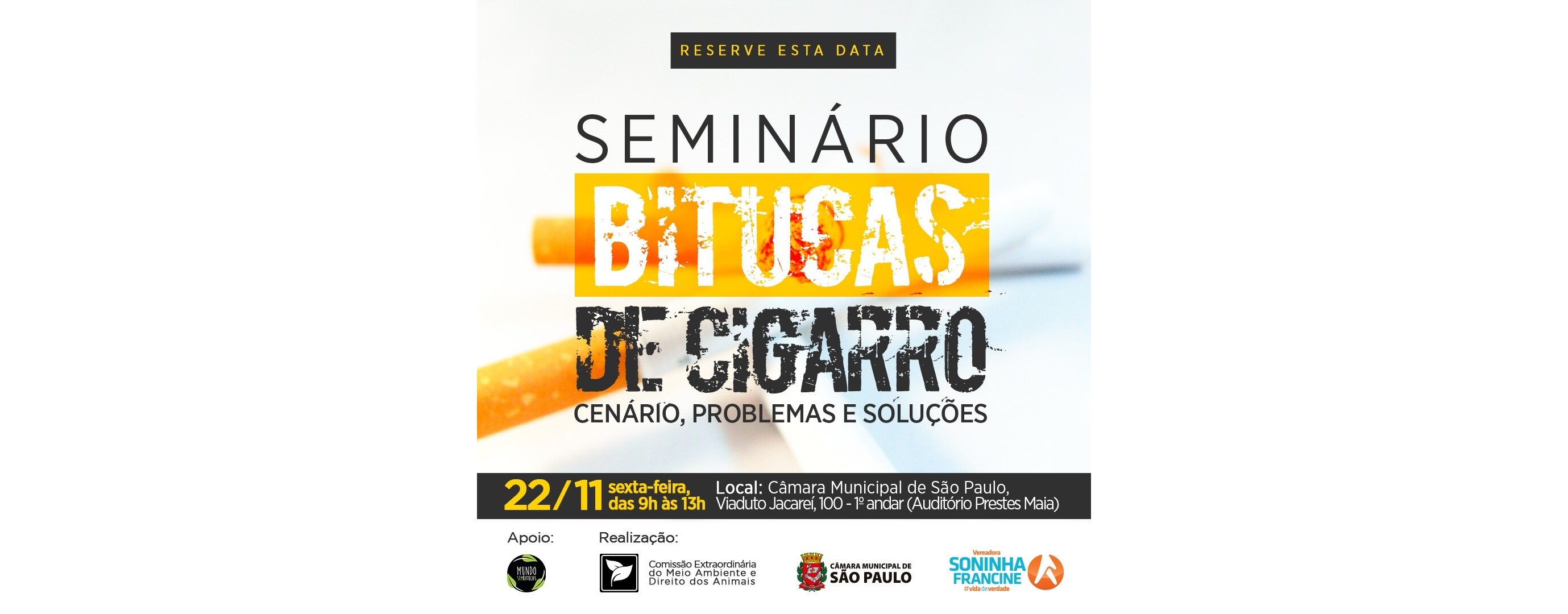 A Comissão Extraordinária Permanente de Meio Ambiente e Direito dos Animais da Câmara Municipal de São Paulo realiza, em parceria com o Movimento Mundo Sem Bitucas e por requerimento da vereadora Soninha Francine (CIDADANIA), o Seminário – Bitucas de cigarro: cenário, problemas e soluções.