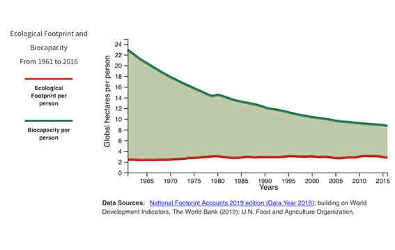 Em vários países, o principal fator de pressão para a exploração desenfreada dos recursos naturais é o crescente nível de consumo, mas no caso do Brasil o problema é a acentuada queda na biocapacidade, como mostra o gráfico abaixo. A biocapacidade de uma cidade, estado ou nação representa o quanto seus ativos ecológicos (incluindo terras agrícolas, pastagens, terras florestais, áreas de pesca e terras construídas) conseguem produzir.
