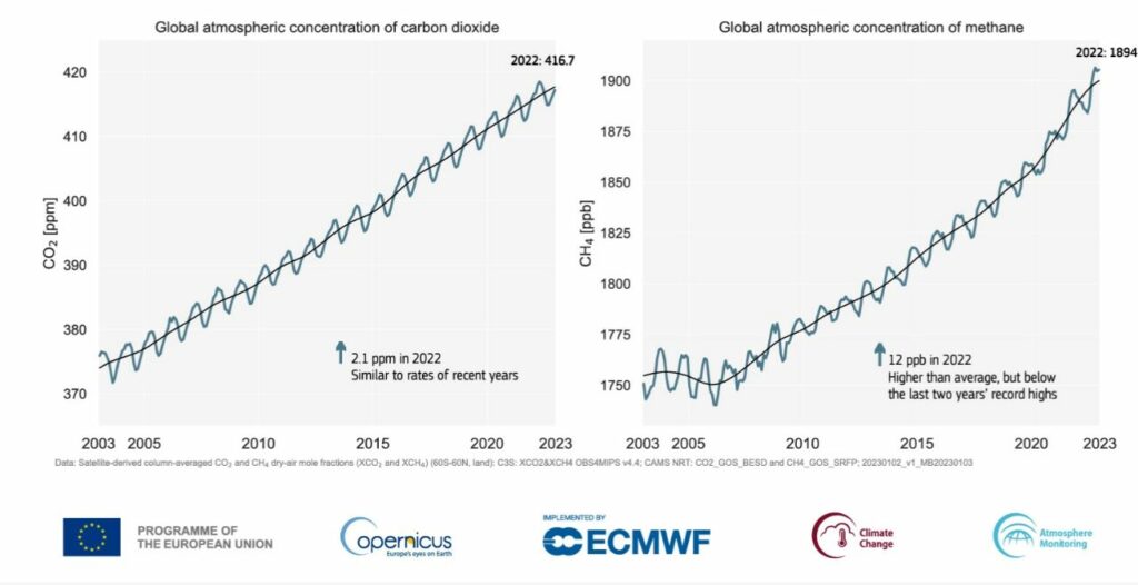 Os dados sobre emissões de gases-estufa apresentados no relatório, no entanto, mostram que o planeta segue em direção oposta. Em 2022 foram registradas as concentrações mais altas de CO2 e gás metano desde que o programa iniciou suas medições. Se considerados levantamentos feitos por outras entidades científicas, “as concentrações são as mais elevadas em centenas de milhares a milhões de anos”, aponta o relatório.
