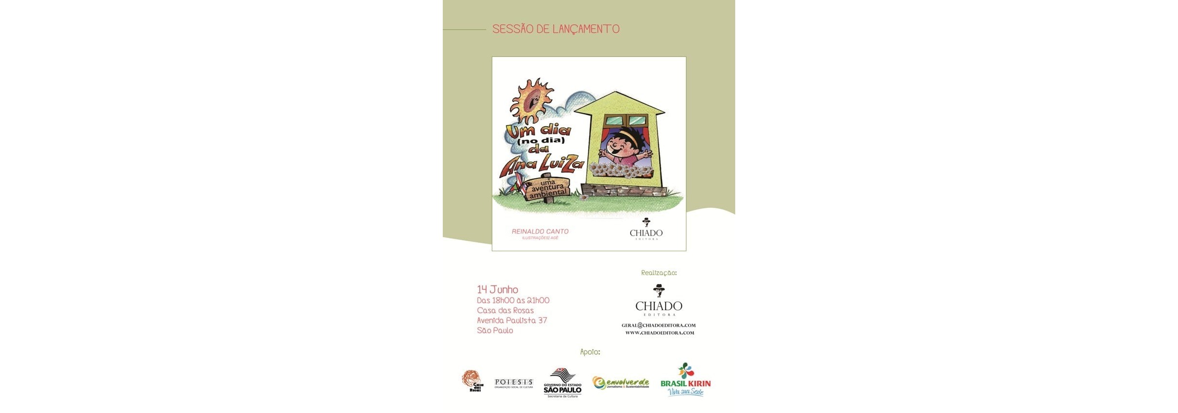 A Chiado Editora e o autor Reinaldo Canto, apresentam a obra “Um Dia no Dia de Ana Luiza – Uma aventura Ambiental”. O lançamento oficial com apoio e organização da Envolverde acontece hoje (14), na Casa das Rosas.