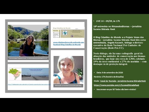 Nesta 14ª live do Blog Cidadãos do Mundo, a 18ª entrevistada do Vozes dos Biomas – jornalista Sucena Shkrada Resk é a bióloga Angela Kuczach, diretora-executiva da Rede Nacional Pró-Unidades de Conservação (Rede Pró-UC).
