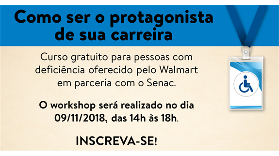 O Walmart, em parceria com o Senac, oferece gratuitamente um workshop voltado às perspectivas de carreira de pessoas com deficiência, com foco em crescimento profissional, levando os participantes a refletir sobre como ser agente da própria mudança no universo corporativo. O encontro está marcado para 9 de novembro, das 14h às 18h, e acontecerá simultaneamente nas unidades do Senac no centro de Osasco e no bairro Água Branca, na cidade de São Paulo.