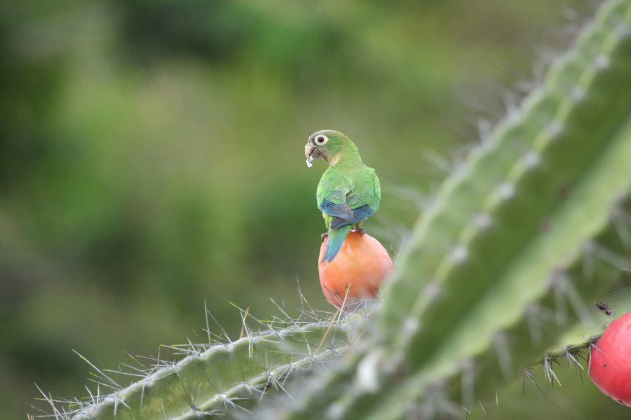 Imagem de destaque: Um periquito-da-caatinga se alimenta do fruto do mandacaru, na Reserva Natural Serra das Almas, entre Crateús (CE) e Buriti dos Montes (PI | Foto: Samuel Portela / Associação Caatinga