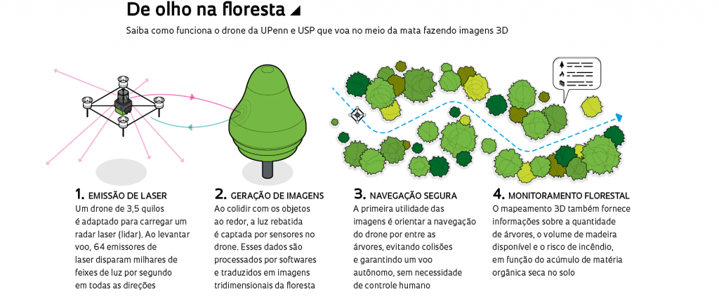 Outro pesquisador brasileiro participou da construção de um drone, projetado na Universidade da Pensilvânia (UPenn), nos Estados Unidos, que transita entre as árvores por baixo do dossel. Com apoio da FAPESP, o cientista da computação Guilherme Nardari passou parte de 2019 trabalhando no laboratório General Robotics, Automation, Sensing & Perception (Grasp) da UPenn em um drone que voa por dentro de florestas plantadas fazendo imagens tridimensionais (3D).