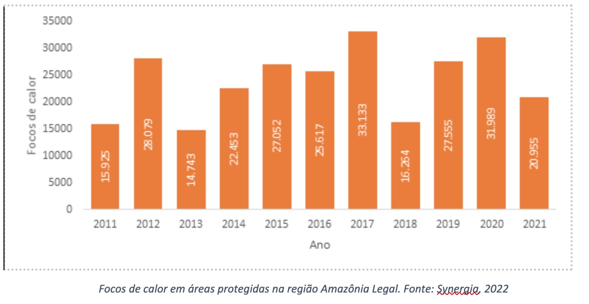 As Unidades de Conservação e as Terras Indígenas situadas na chamada Amazônia Legal correm risco de incêndio, considerando-se o alto índice de focos de incêndio detectados nos últimos anos. Somente em 2021, 20.955 focos de calor foram identificados na região conforme aponta o recém-lançado relatório da consultoria socioambiental Synergia. Presente na Amazônia há mais de 10 anos, a consultoria passa a reportar os dados de focos de incêndio na região com boletins trimestrais.