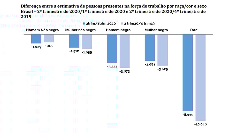 Os dados foram obtidos a partir da Pesquisa Nacional por Amostra de Domicílios Contínua (Pnad Contínua), realizada pelo Instituto Brasileiro de Geografia e Estatística (IBGE), e demonstram que a maioria das pessoas que saíram da força de trabalho são negras. Entre o 1º e o 2º trimestre de 2020, cerca de 6,4 milhões de homens e mulheres negras perderam seus empregos ou deixaram de procurar trabalho devido à falta de perspectiva, enquanto as pessoas brancas na mesma situação somam cerca de 2,4 milhões.
