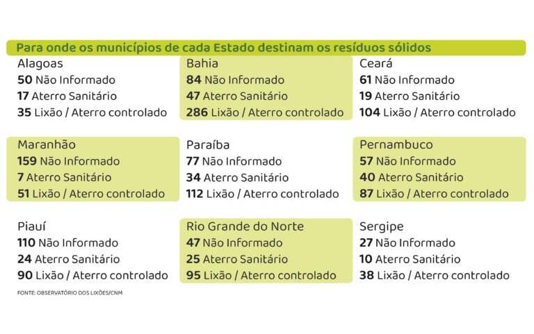 Declaradamente, a Bahia tem o maior número de cidades a destinar seus resíduos a lixões, 286; seguida pela Paraíba, com 112 municípios de 223; e o Ceará, 104 de 184. O Estado do Nordeste que menos destina resíduos a lixões declaradamente é Alagoas: 35 dos seus 102 municípios; seguido por outro Estado pequeno, Sergipe, 38 de apenas 75. Depois vem o Maranhão, com 51. Muito importante destacar que estes são os dados informados. Ao todo, 159 municípios do Maranhão não informaram; seguidos por 110 do Piauí; e 84 na Bahia.