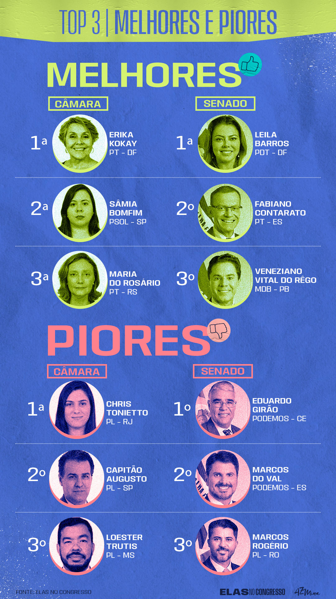 No Senado, quem encabeça a lista de atuações favoráveis é Leila Barros (PDT-DF), com 11 PLs distribuídos entre seis temas: violência contra a mulher, feminicídio, licença-maternidade, economia, trabalho e educação. A última posição fica com o senador Eduardo Girão (PODEMOS-CE), com quatro projetos desfavoráveis aos nossos direitos, sobre aborto, maternidade e microcefalia.